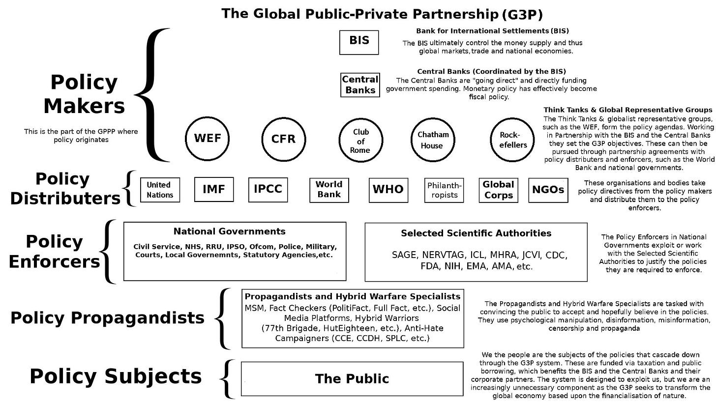 This chart, showing the general structure of the network, was created by Iain Davis and explained in his essay “What is the Global Public-Private Partnership?”.